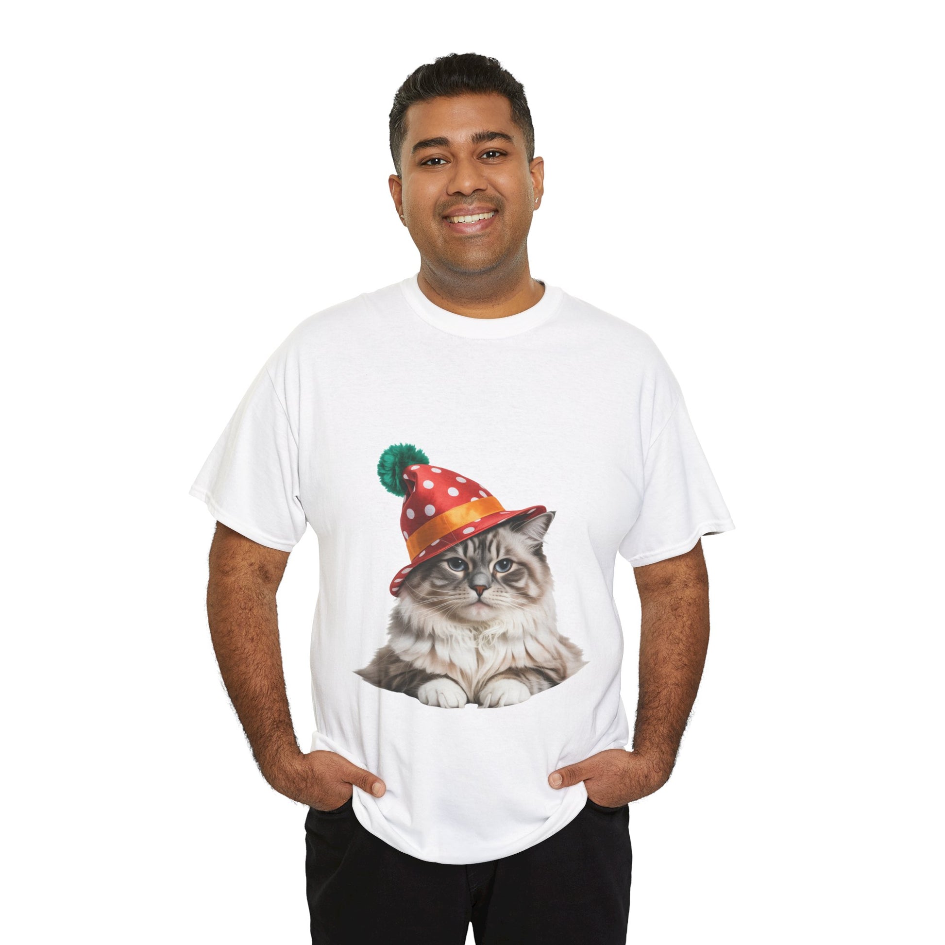 Soft, breathable cotton meets quiet humor. This classic crew tee features a detailed print of a fluffy Ragdoll cat wearing a hand-painted, slightly lopsided Christmas party hat. The cat’s expression is equal parts judgmental and endearing — the kind of little moment that smiles without shouting. Wear it around the house on slow Sundays, bring it to low-key gatherings, or let it be the conversation starter at a casual holiday get-together. The medium-weight fabric holds the print crisply and the neat neckline and relaxed cut let the shirt sit comfortably under a cardigan or on its own. For anyone who loves understated, whimsical pet art, this tee fits naturally into everyday wear and cozy celebrations.