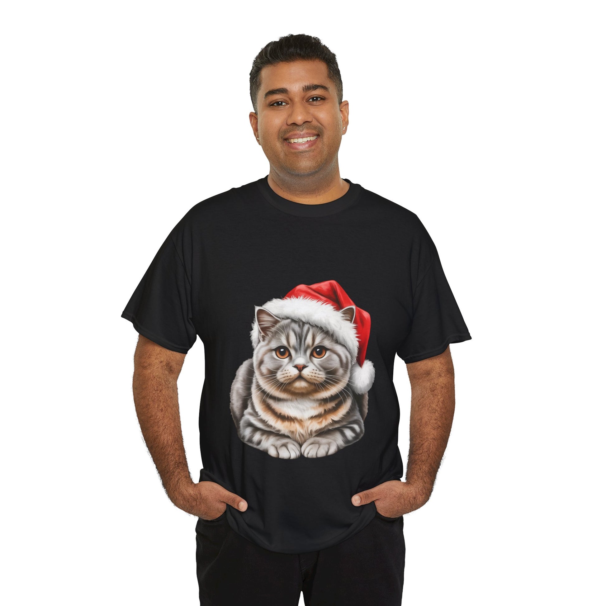 A soft, mid-weight tee printed with a cozy holiday illustration: a round-faced tabby kitten wearing a plush Santa hat. The art sits center-front with warm, hand-rendered shading that keeps the look playful but not fussy. This shirt settles into everyday wear easily — lounge days, quick errands, or low-key seasonal gatherings — and feels like slipping into a familiar sweater without the bulk. The fabric breathes, the collar holds its shape, and the side seams keep the silhouette tidy wash after wash. For cat lovers who favor subtle holiday spirit, this tee quietly announces your vibe without shouting it.