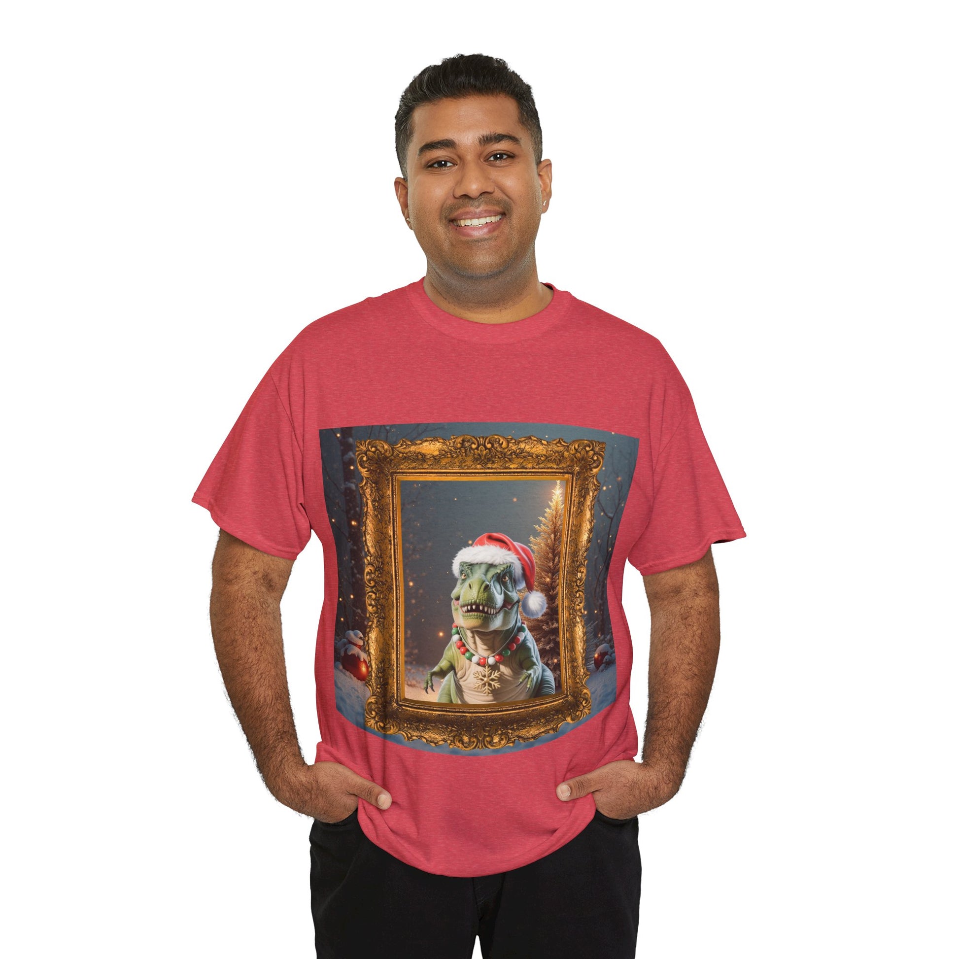 A playful, vintage-inspired tee that turns holiday cheer into a cheeky conversation starter. Centered on a framed portrait of a dinosaur wearing a Santa hat and festive garland, the print blends nostalgic oil-painting vibes with modern holiday kitsch. Lightweight but sturdy cotton keeps the shirt comfortable for all-day wear while the tear-away label and ribbed collar ensure a soft, no-fuss fit. Wear it to cozy family gatherings, quirky office parties, or casual winter outings when you want to bring humor and a touch of retro flair to the season.