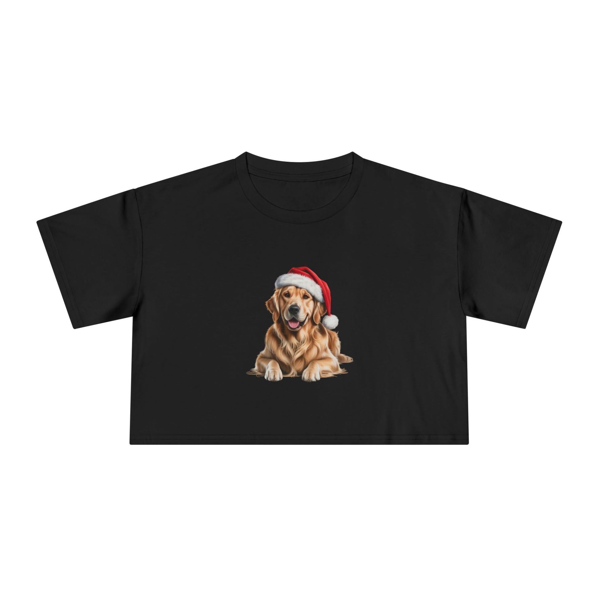 Soft, relaxed, and quietly festive — this cropped tee brings a gentle holiday smile to everyday wear. The lightweight cotton sits comfortably against skin while the dropped shoulders and boxy cut create an effortless, laid-back silhouette. At the center, a warm golden retriever wearing a Santa hat adds a cozy, heartwarming touch that reads like a winter memory: a pup lounging by twinkling lights, steam from cocoa in the air, and slow afternoons at home. Reach for this when you want comfort without fuss, to layer under an open cardigan, or to wear with high-waisted jeans on chilly mornings. It’s designed to feel lived-in from the first wear and to carry the nostalgia of small seasonal moments with understated charm.