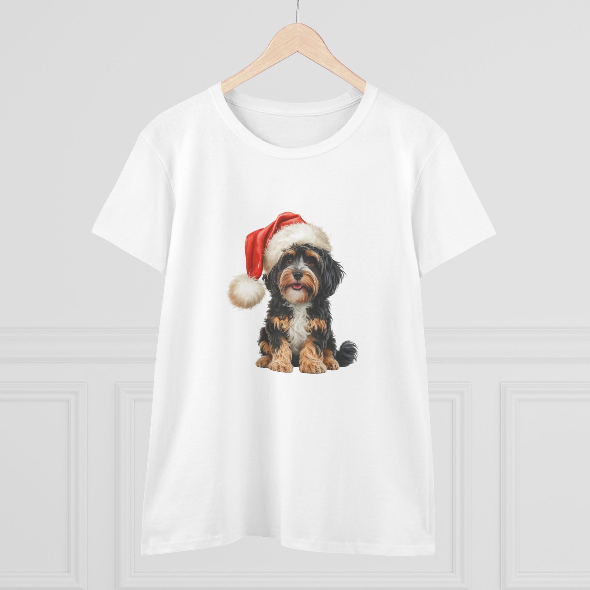 Embrace comfort and style with this Women's Midweight Cotton Tee, perfect for any casual occasion. Its soft, breathable fabric will keep you comfy all day long, making it an ideal choice for relaxing at home, running errands, or meeting friends for brunch. This tee, featuring a playful design, is a delightful addition to any pet lover's wardrobe, especially during festive seasons like Christmas. Celebrate the joy of the holidays or just enjoy everyday wear with this charming shirt that fits seamlessly into your lifestyle. A thoughtful gift for dog owners, this tee adds a touch of fun to any celebration or casual day.