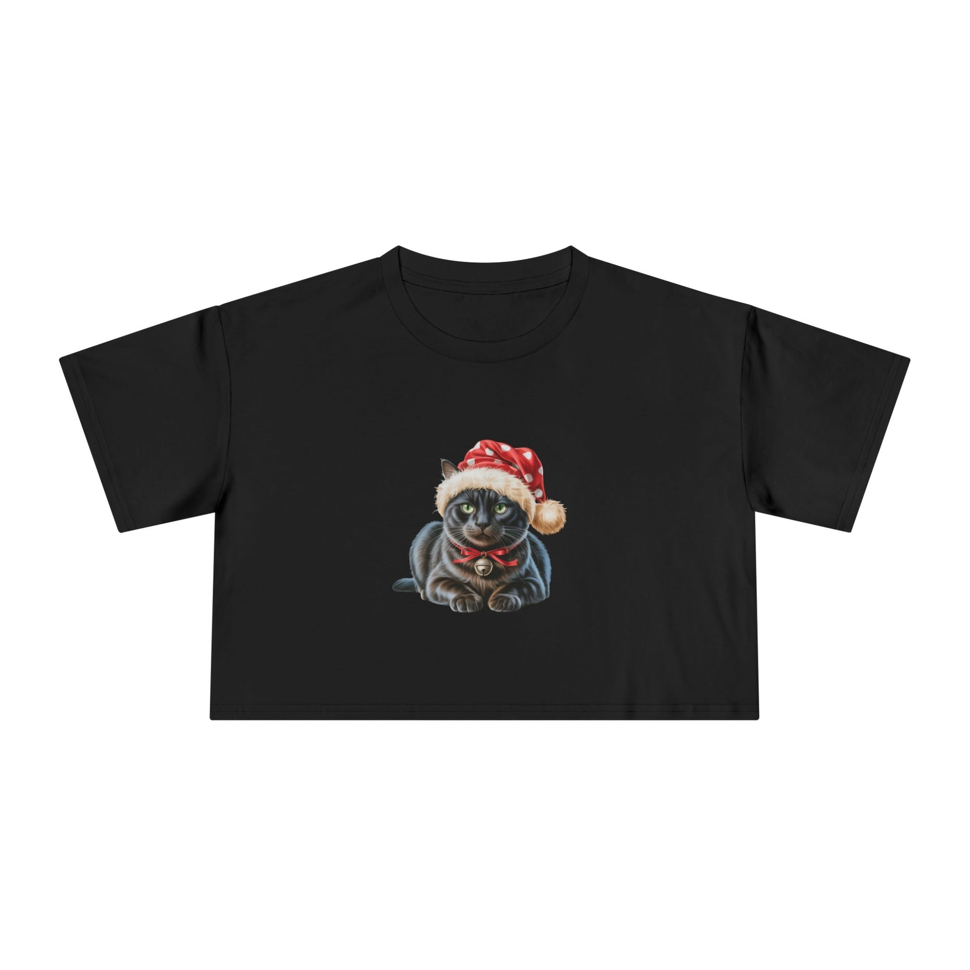 Holiday Black CAT Crop Tee — Cute Black Cat in Santa Hat Women's Crop Top