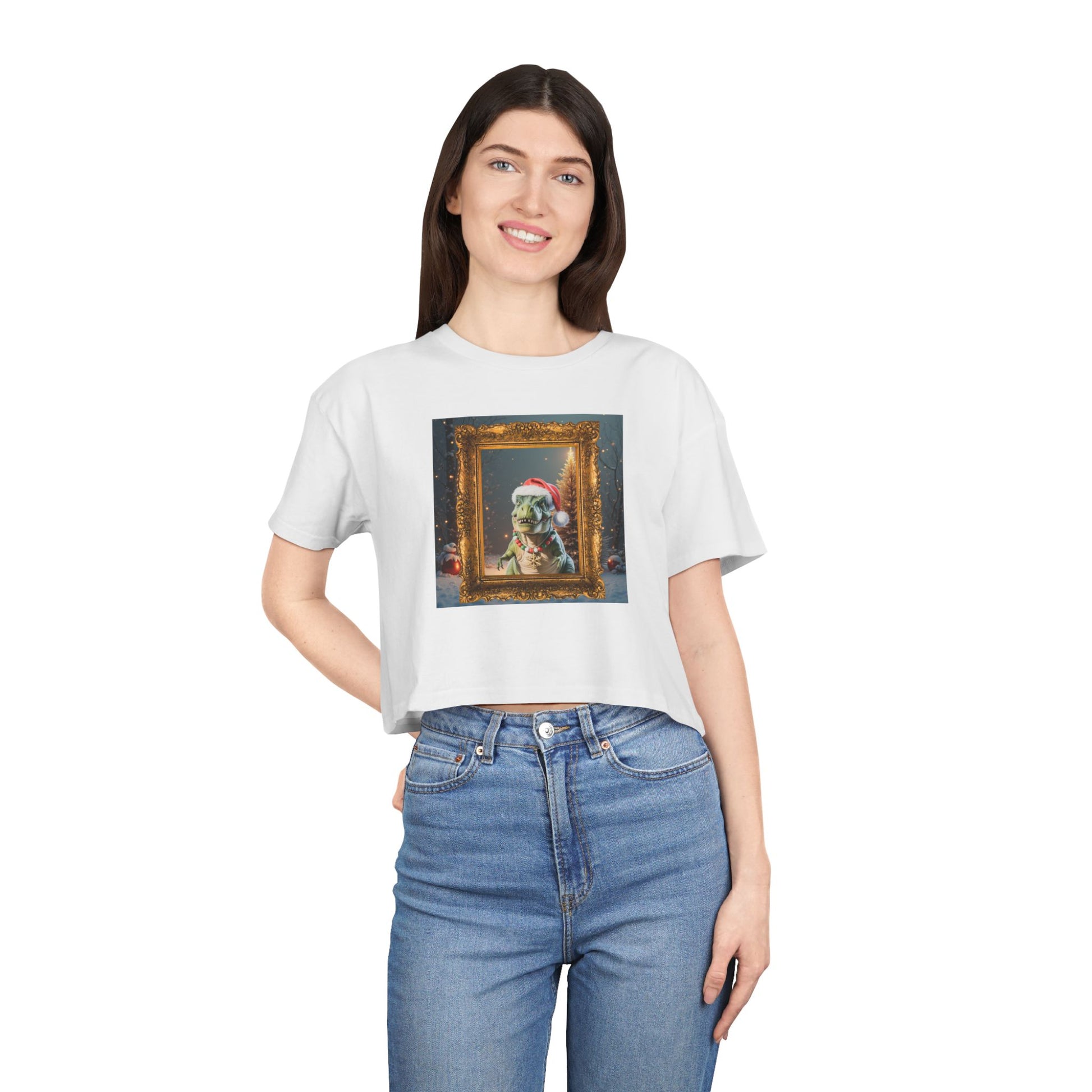 Holiday Dinosaur Portrait Crop Tee — Cute Dinosaur in Santa Hat Graphic