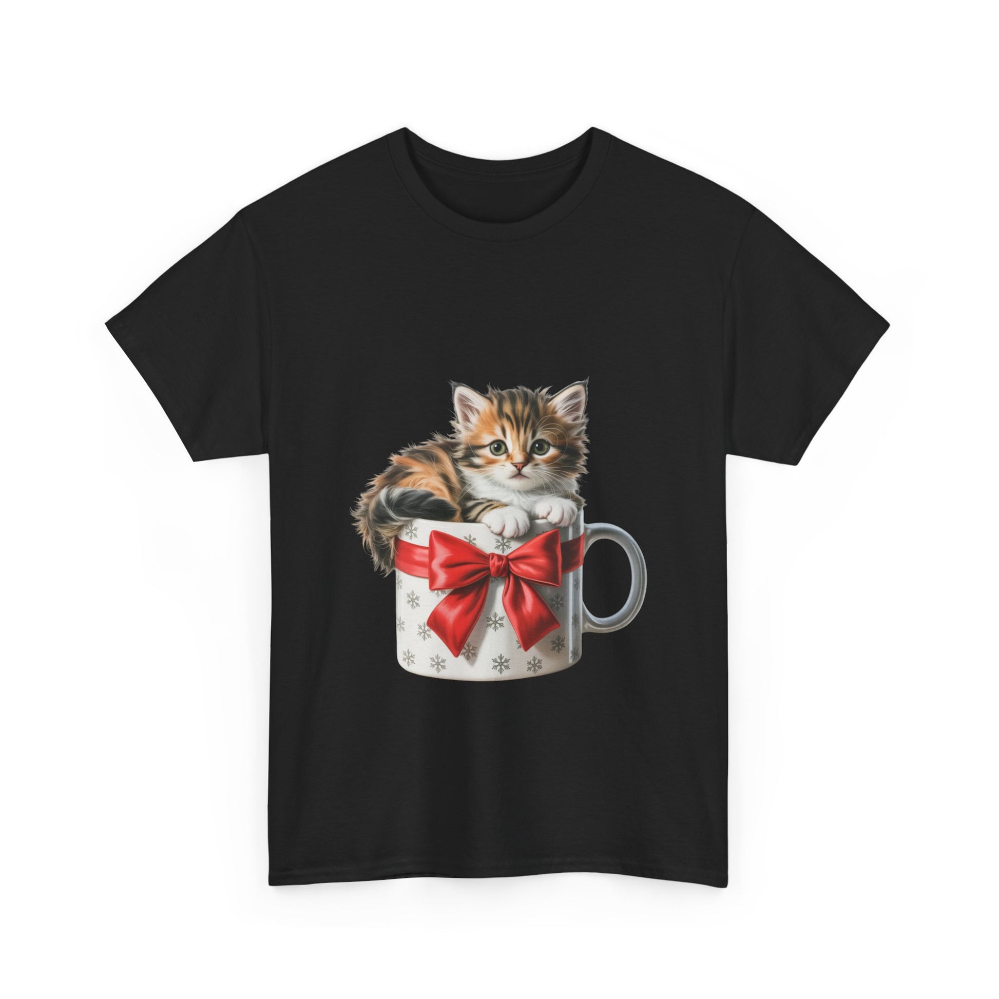 Kitten in a Gift Mug T-Shirt — Cute Cat Christmas Tee with Red Bow