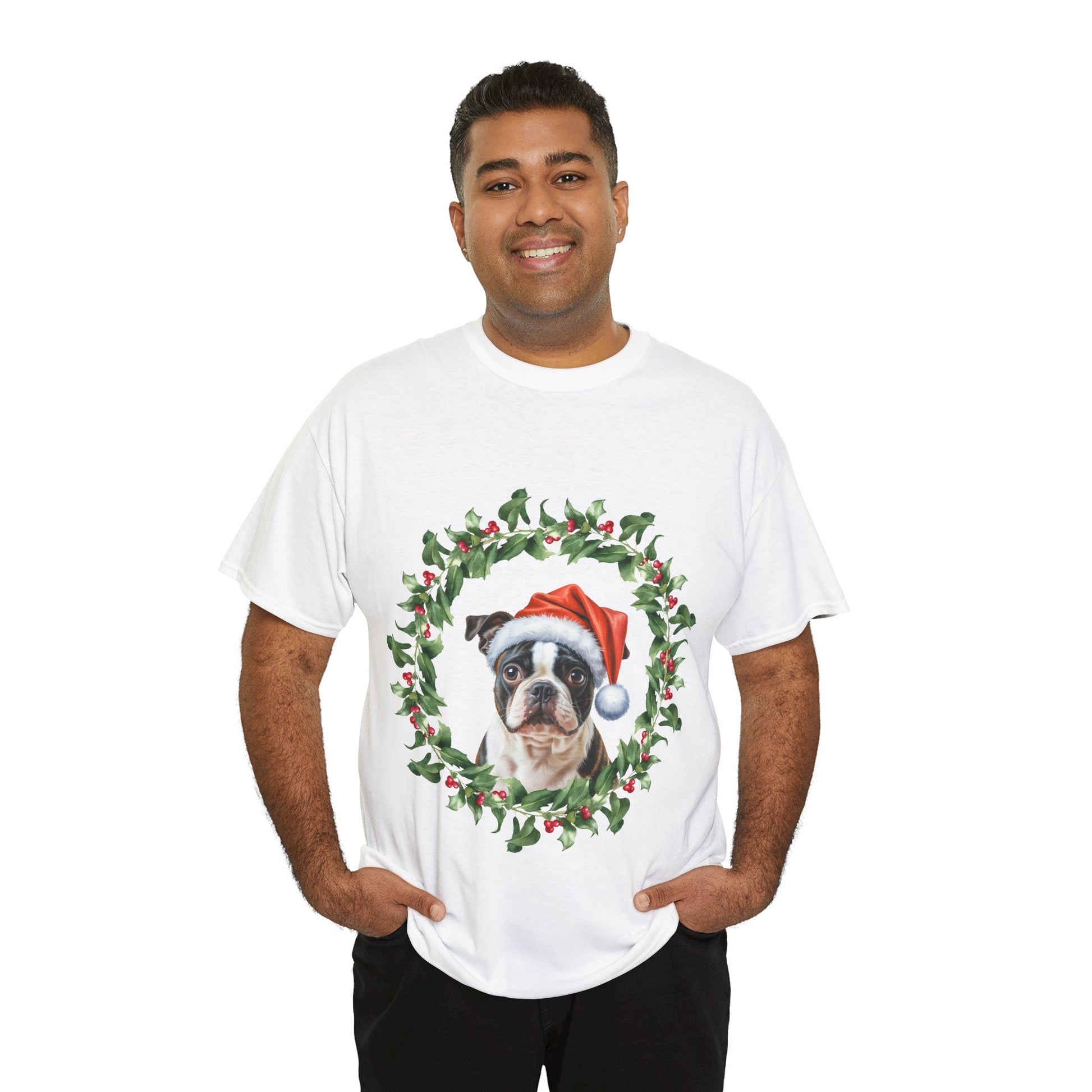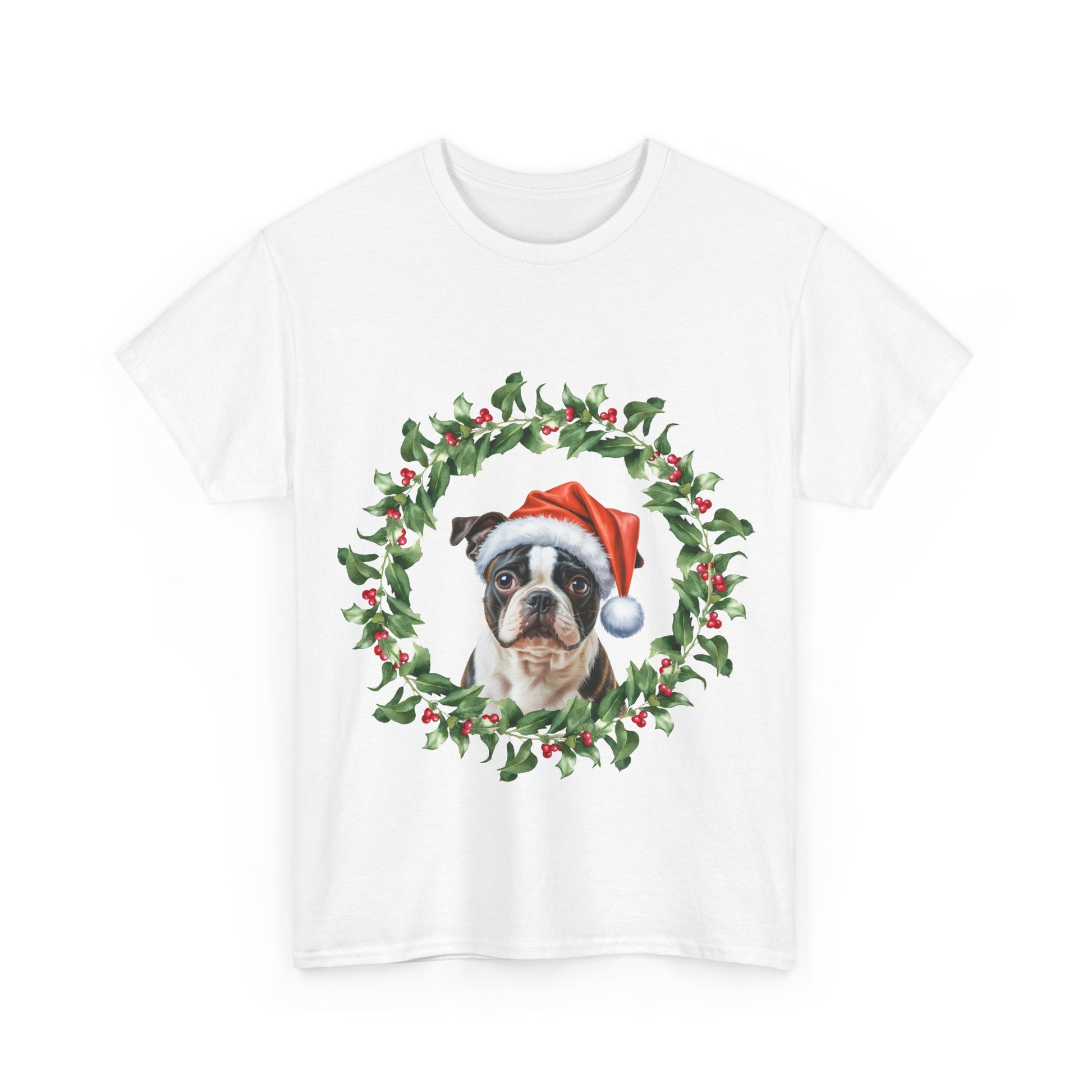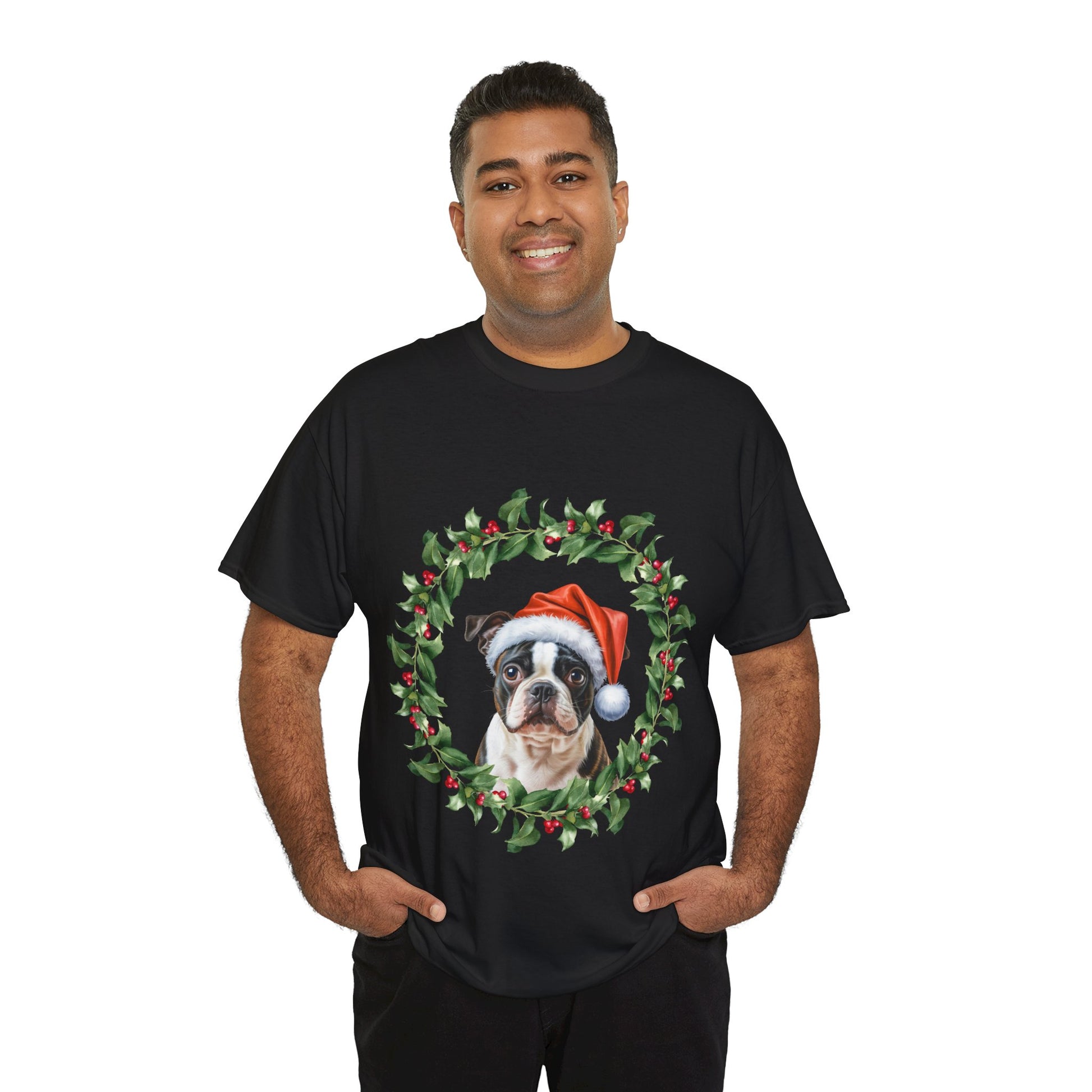 Boston Terrier Christmas wreath T-Shirt – Holiday Dog Lover Tee, Festive Small Dog Shirt, Cute Boston Terrier Xmas Gift, Pet Lover Apparel, Holiday Puppy Shirt for Boston Terrier Lovers